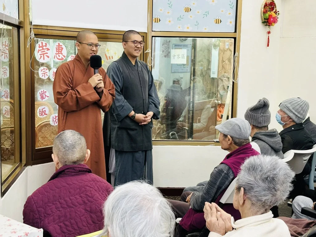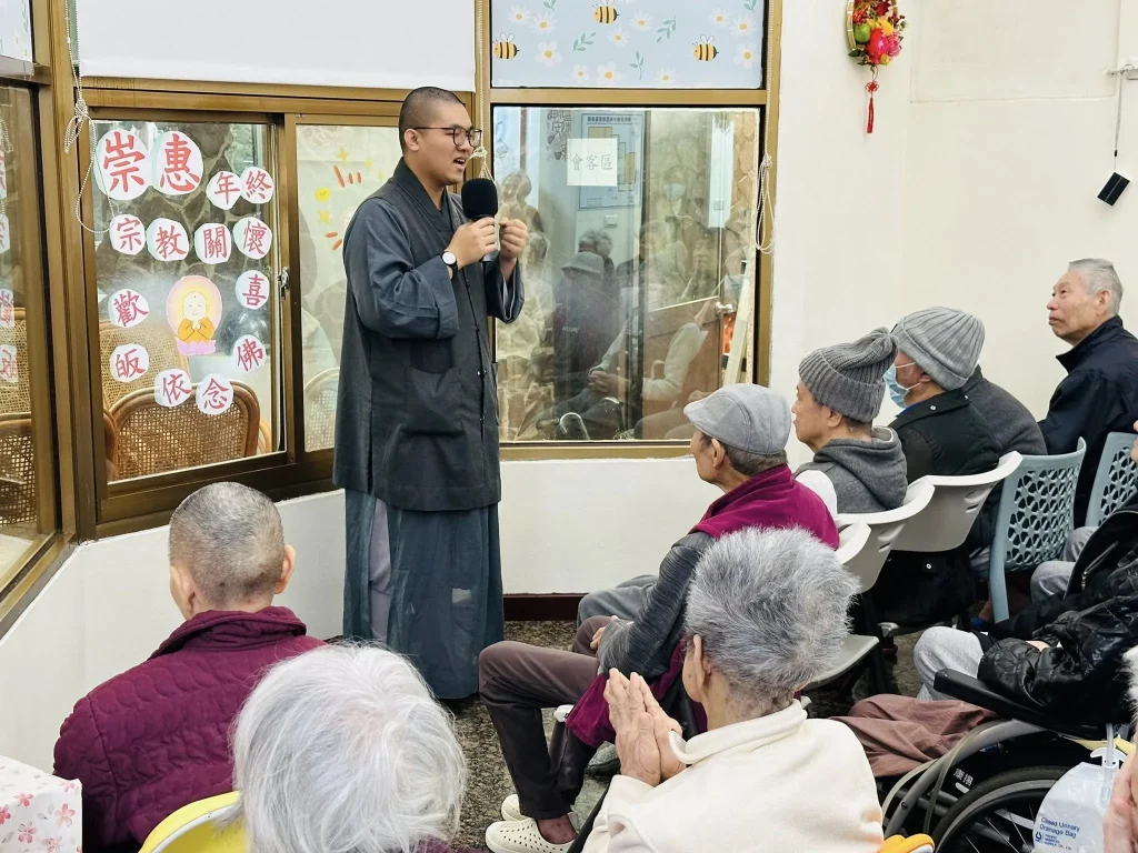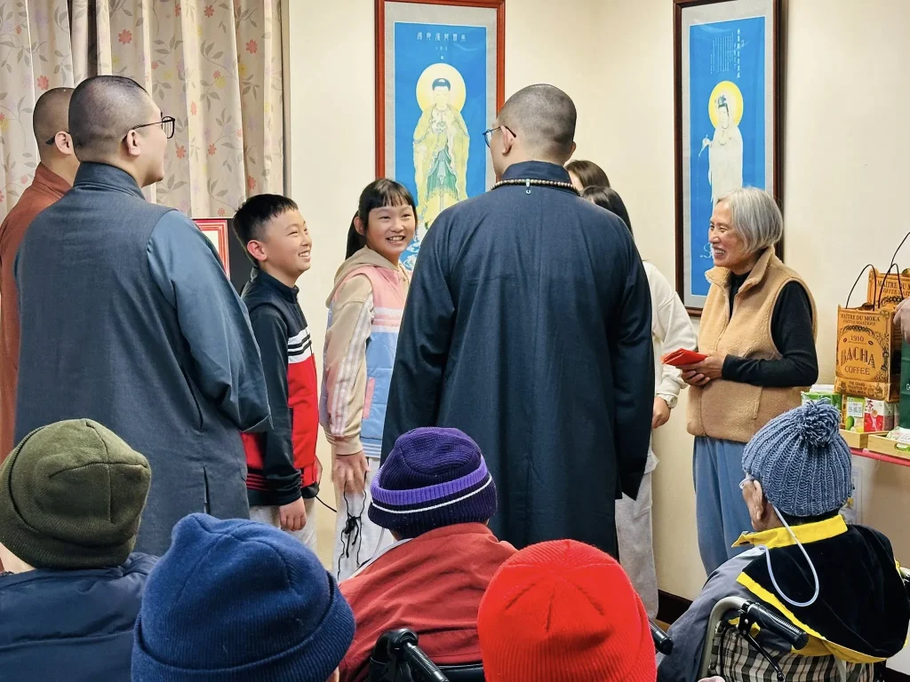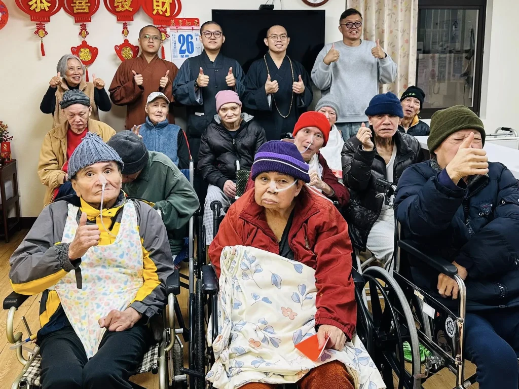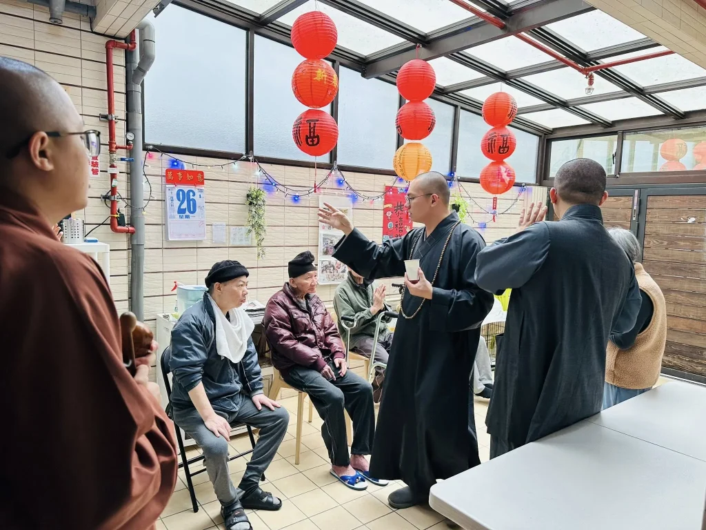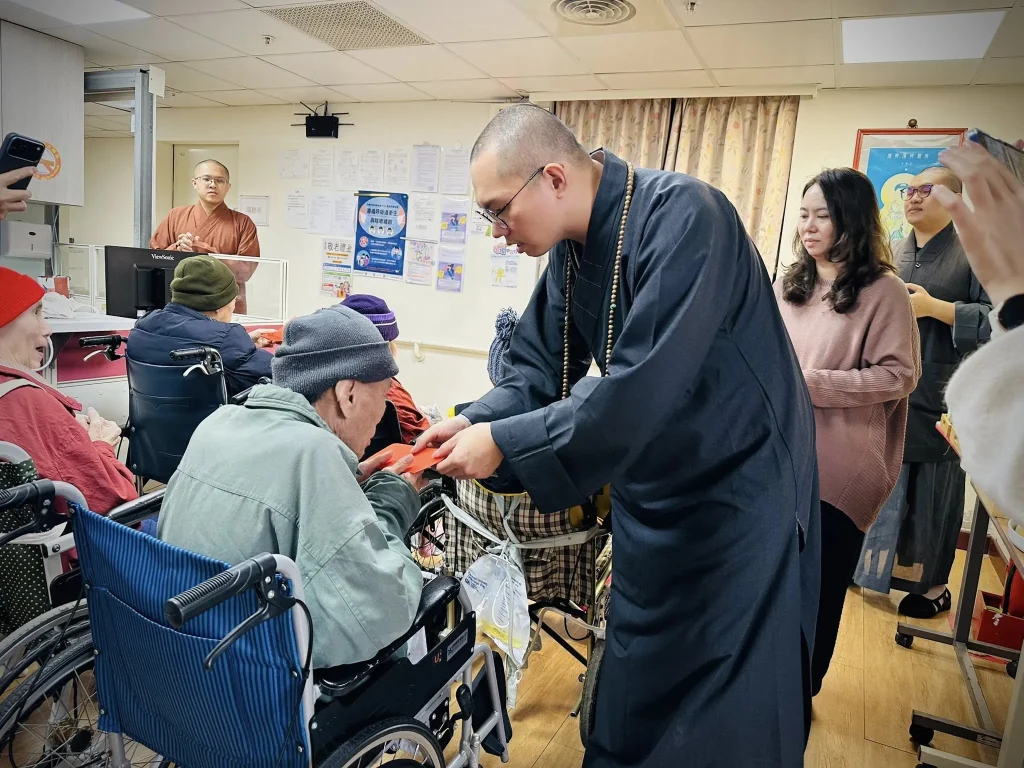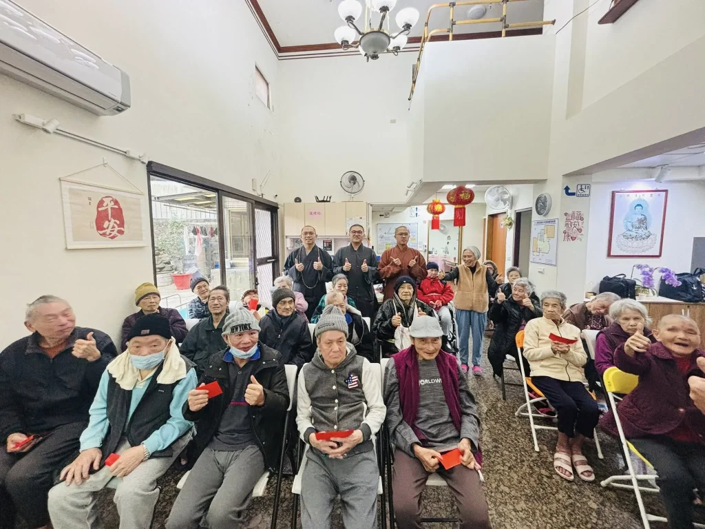 師父就在長輩身邊關心著、聊著,長輩們一句接一句回應,慈悲的音聲流動在空間裡。最後當紅包一一遞到長輩手中時,看見他們握著紅包的笑容,我們都知道,這是一份被放在心上的祝福。很溫暖,也很踏實。