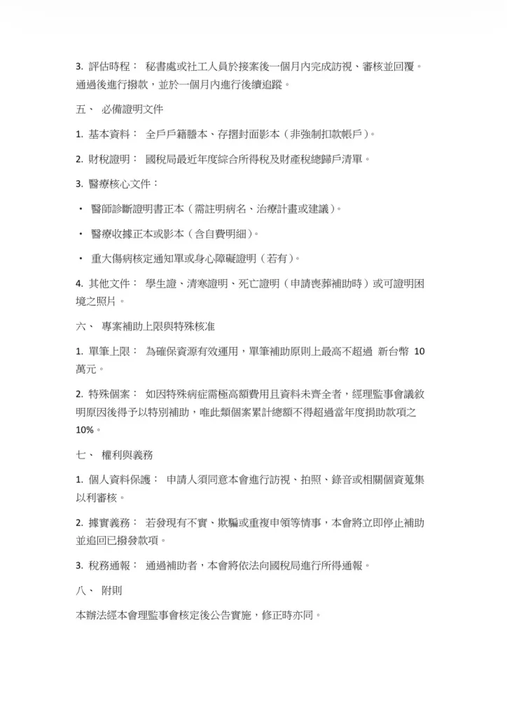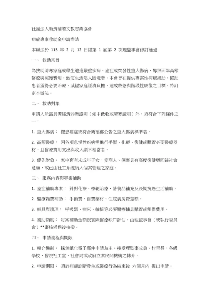 救助基金申請辦法於本會第一屆第二次理監事會制定實施修正(詳見下圖),亦同時讓法會的祝福成為真實的幫助。