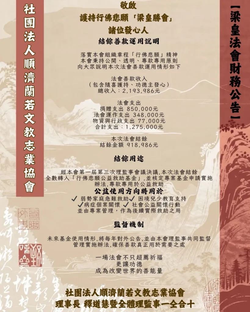 本次法會所有結餘全數轉入「行佛悲願公益救助基金」,使誦經功德不止於祈福消災,更能真正走入人間。